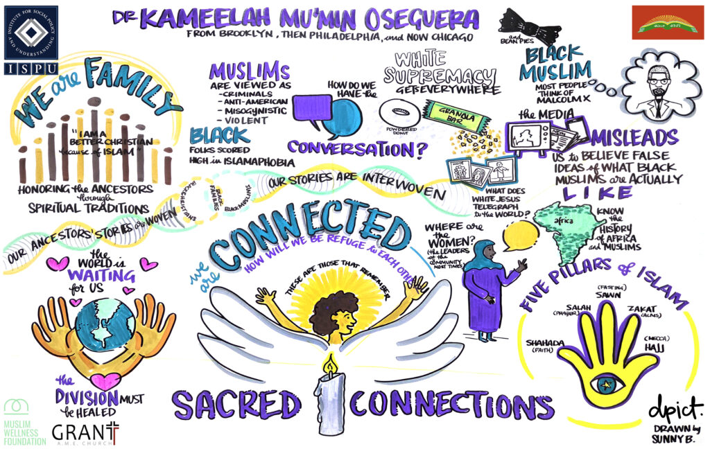 Graphic recording is the art of real-time listening, synthesizing, and translating themes, metaphors, and data points into a hand-drawn visual to show the flow and content of conversation, convening, exchange, or learning. The graphic recorder does not interact with the group or the speakers, they listen and draw.