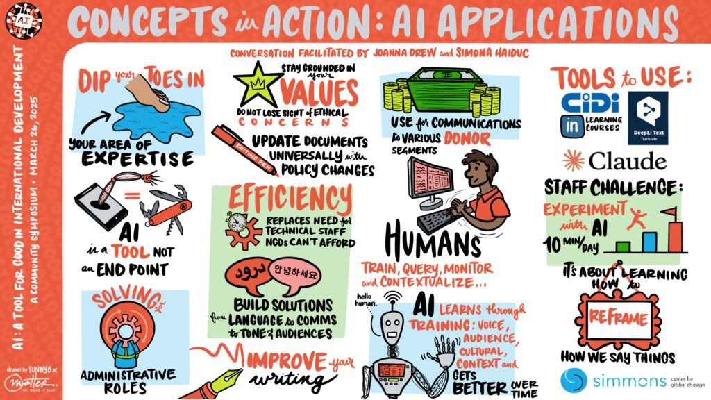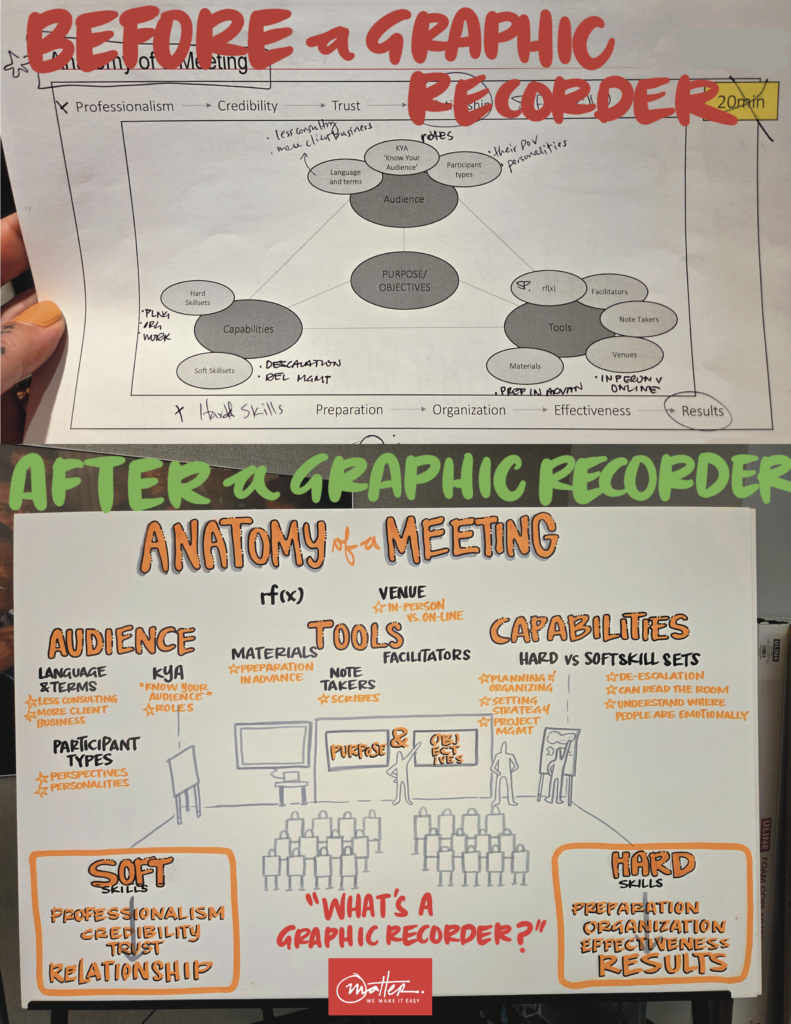 Simply, it creates a record of visual notes for clarity and quick comprehension during an event. The recording is then an artifact – easily shareable post-event, to help remember, to share with others, and to include in the review of work and learning.